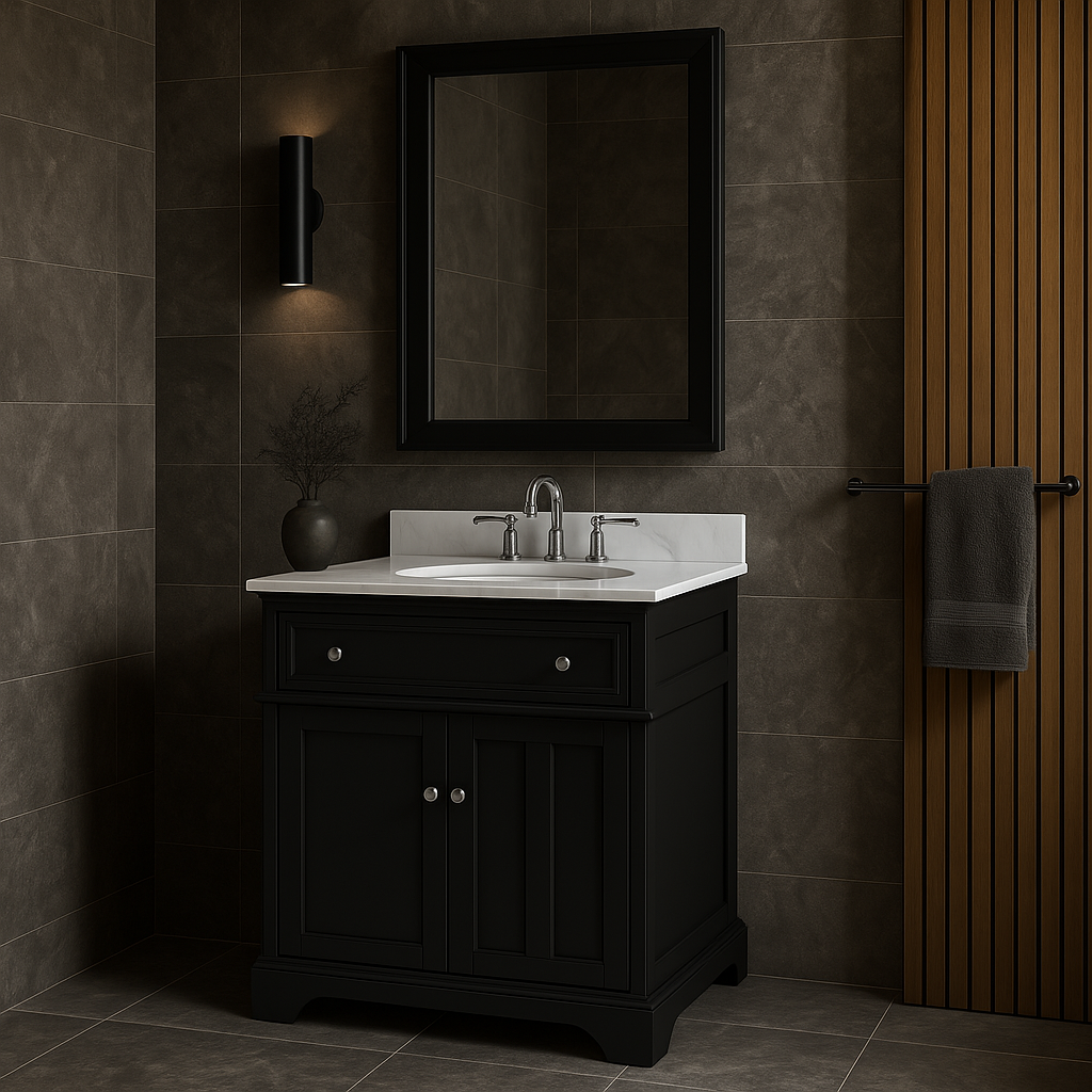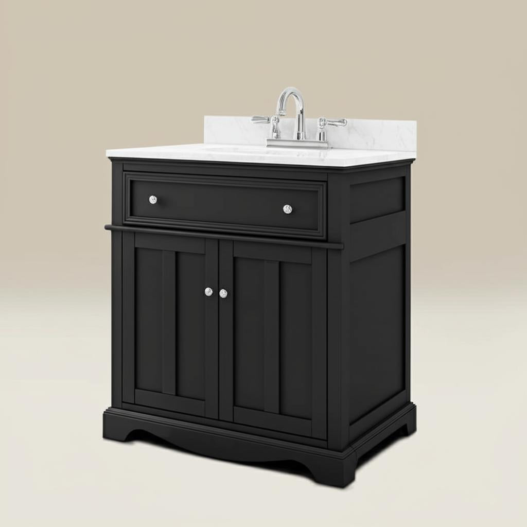 The Fremont Single Sink Vanity combines timeless design with modern functionality. Featuring a sleek black finish, engineered Carrara marble top, and soft-close doors, this vanity is perfect for elevating your bathroom decor.