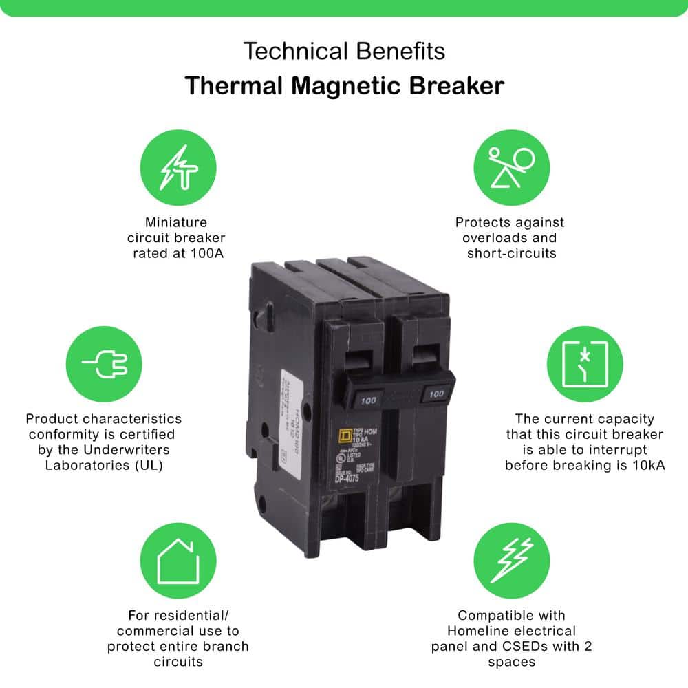 The Square D Homeline 100 Amp 2-Pole Circuit Breaker is an essential component for safe and efficient power distribution in your home's electrical system. Engineered for overload and short-circuit protection, it ensures reliable performance and peace of mind. Compatible with Homeline load centers, this breaker offers the balance of quality and value that Square D is known for.