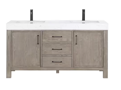 León 60 in.W x 22 in.D x 34 in.H Double Sink Bath Vanity in Fir Wood Grey with White Composite Stone Top