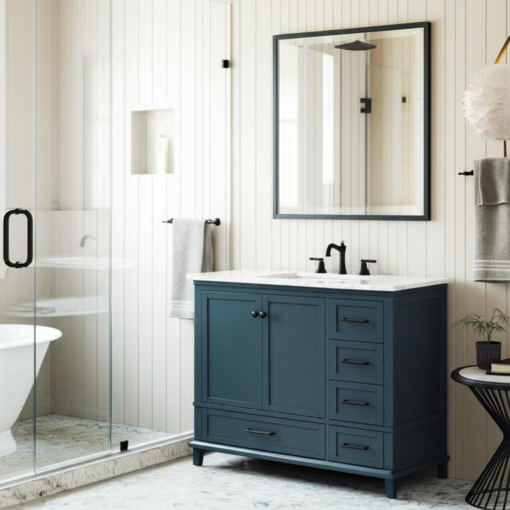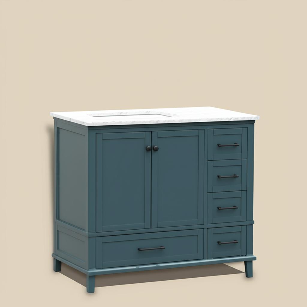 The Merryfield 37-inch Bath Vanity combines timeless design with modern functionality. Featuring an Antigua Green finish, Carrara marble top, and ample storage, this vanity is perfect for enhancing any bathroom space.
