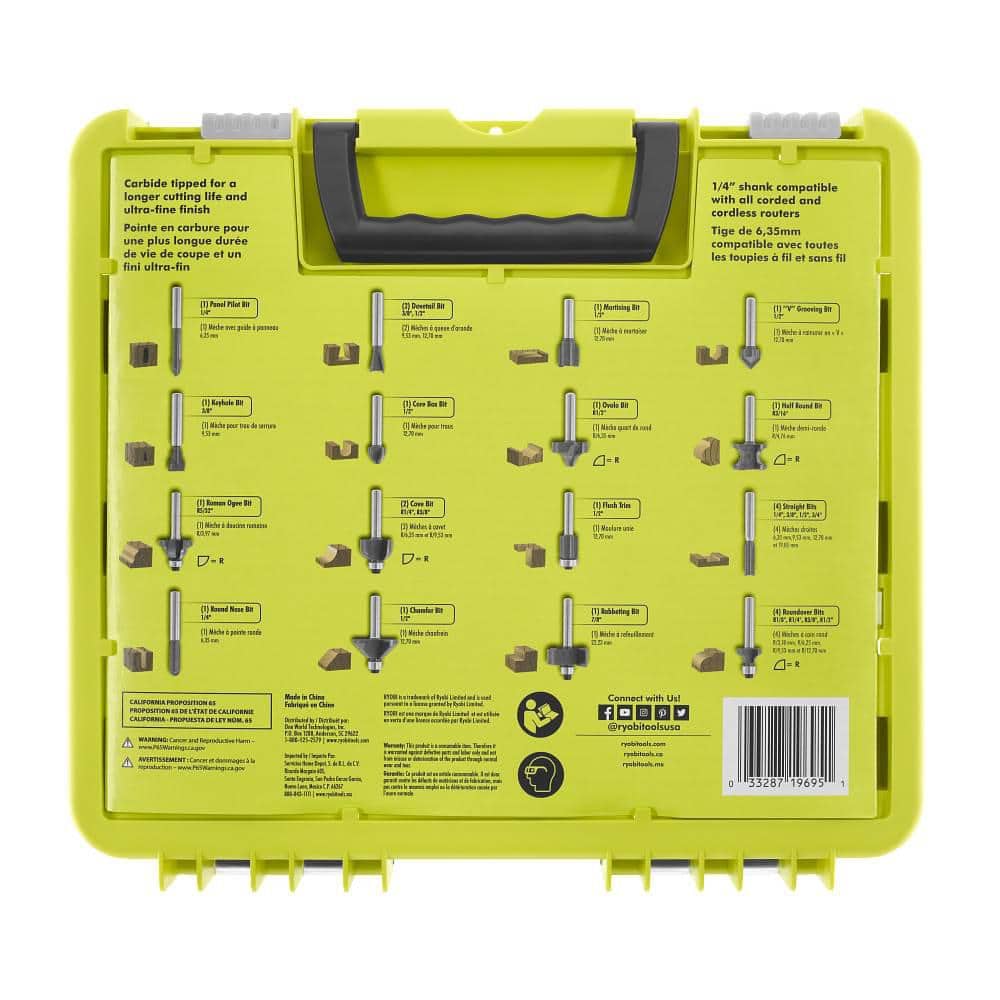 The RYOBI 39-Piece Carbide Router Bit Set is a versatile tool kit designed for professionals and DIY woodworkers who demand precision and quality. This set comes with 1/4 in. shank bits compatible with all routers, perfect for decorative trimming, edging, and joining. Each bit features carbide-tipped edges for a longer cutting life and an ultra-fine finish.