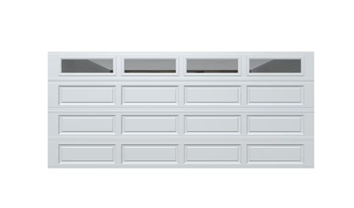 This white double garage door is custom-made with a ranch panel design and clear windows, featuring a three-layer construction of steel, insulation, and ToughGard™ backer. It also includes a standard bottom weather seal to prevent drafts and debris. The door is insulated with foamed-in-place polyurethane for improved thermal efficiency and has anti-drop and pinch resistant panels for added safety. Backed by a limited lifetime warranty, the door requires a minimum of 11 inches of headroom without an opener or 13.5 inches with an opener.